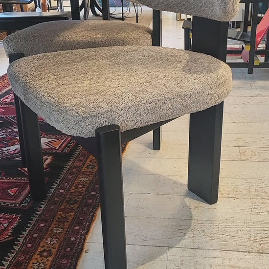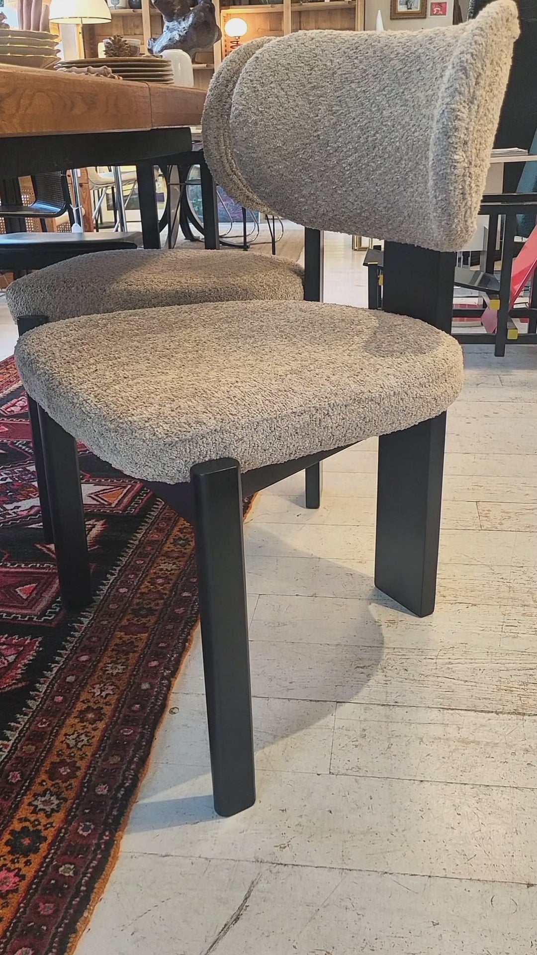 Chaises contemporaines en bois noir et tissu bouclé. 2 disponibles, vendues séparément.