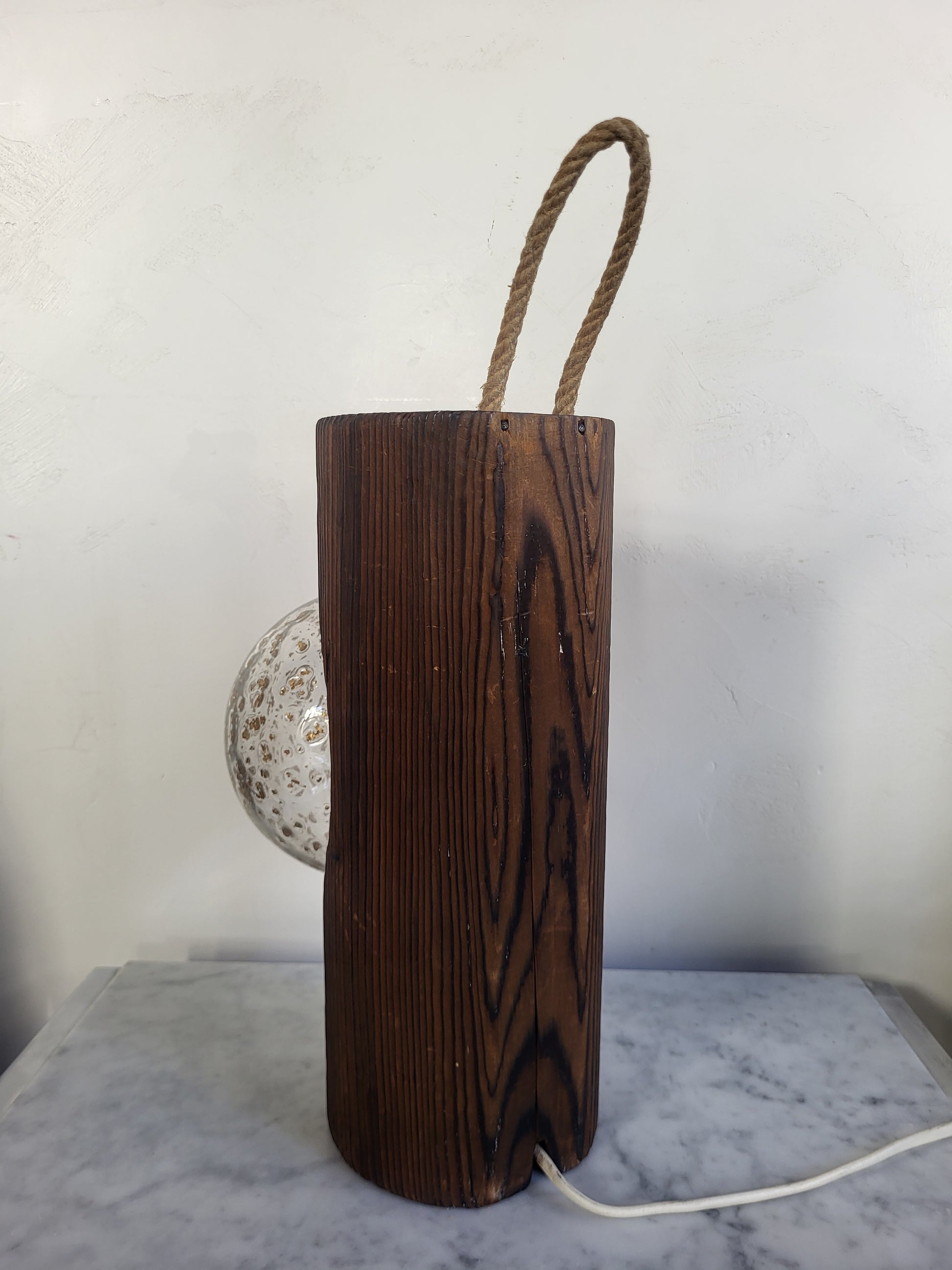 Lampe des années 60 de la marque Allemande Temde Leuchten. Peut être utilisée en lampe murale grâce à son accroche sur le dessus et l'arrière plat du socle en bois. Globe en verre pailleté d'or. Électricité vérifiée. Ampoule e14.
