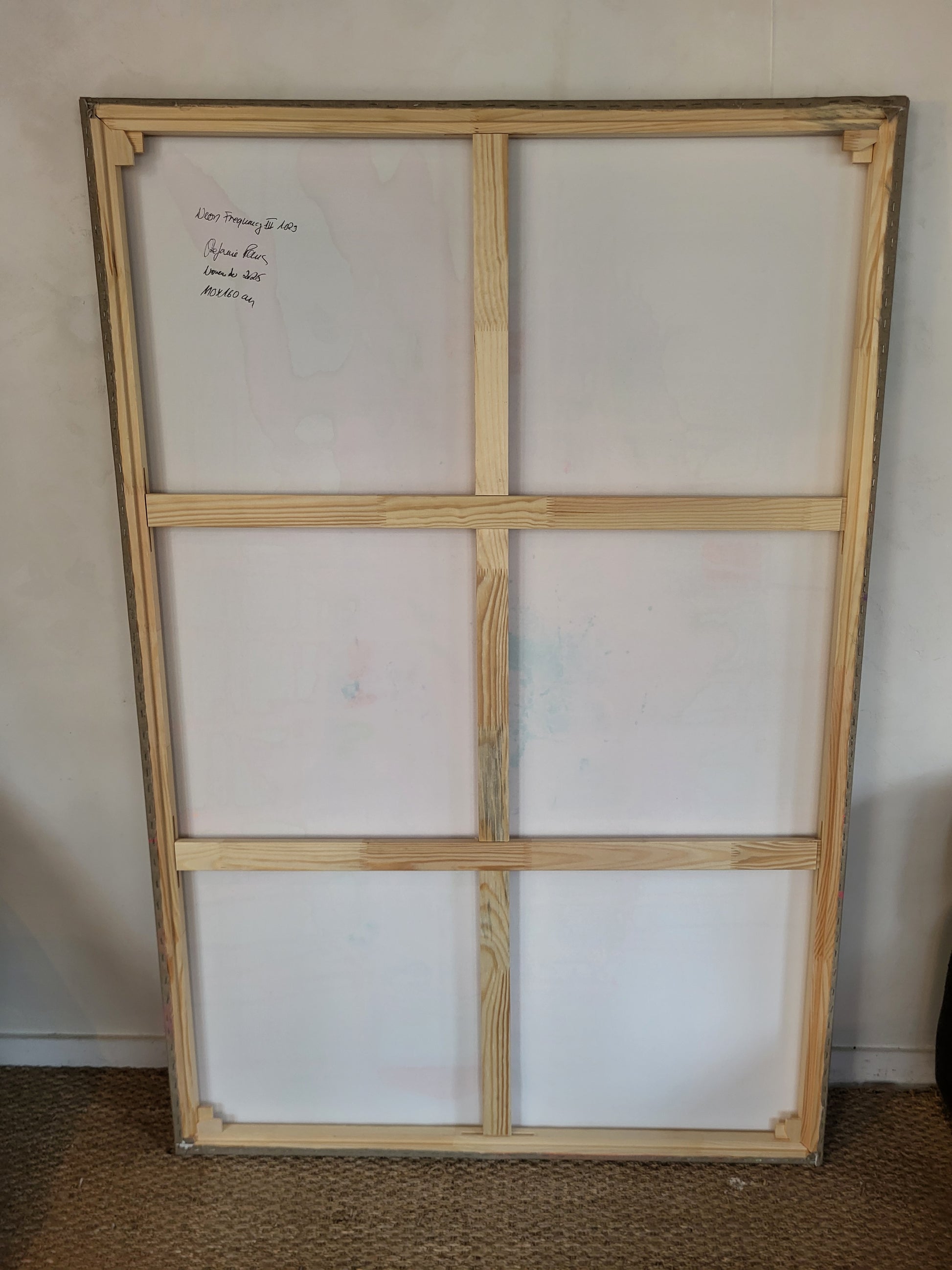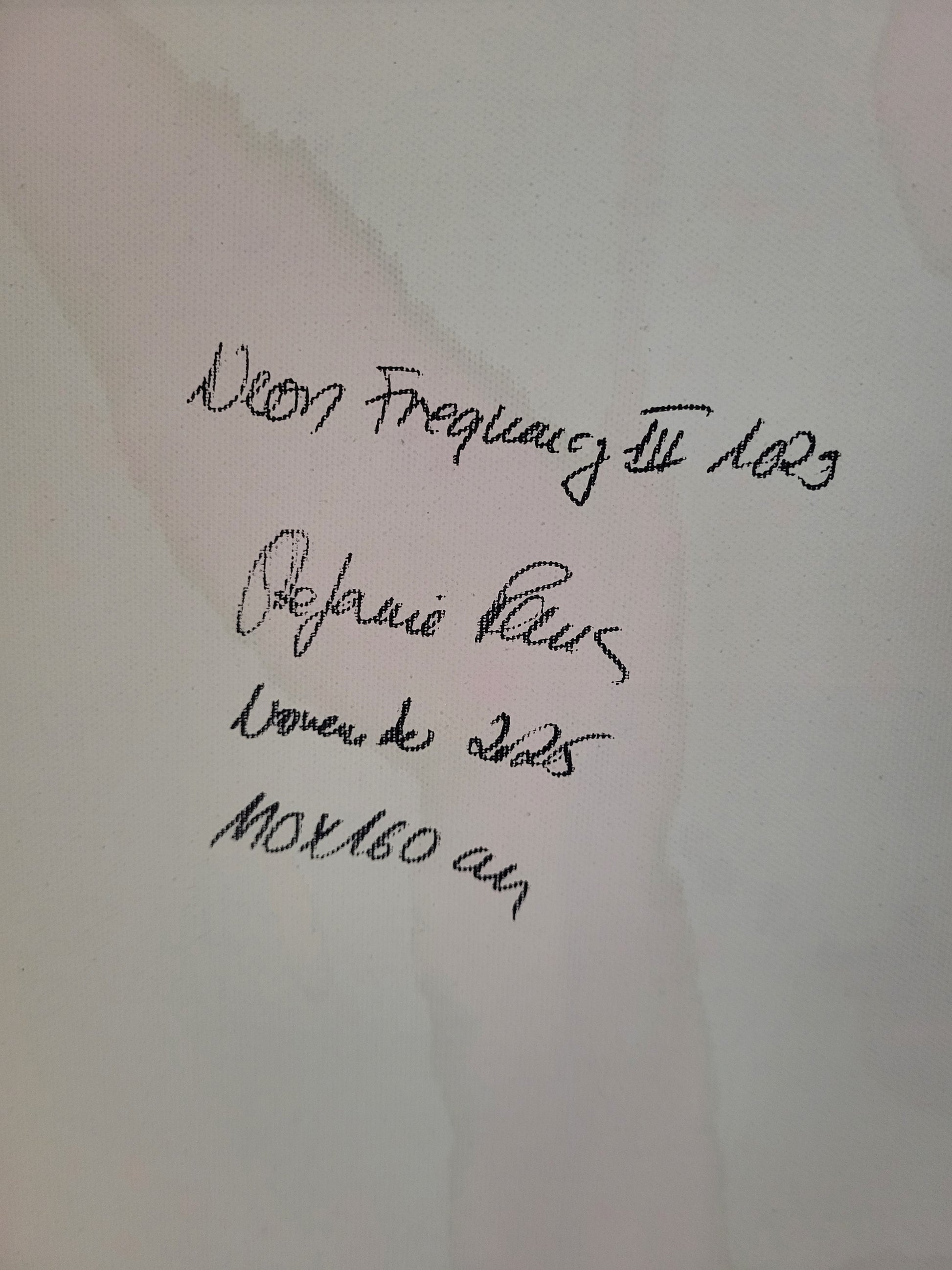 Très grande toile sur chassis, contemporaine, intitulée "Neon Frequency III 1029" par Stefanie Raus. Signée au dos.