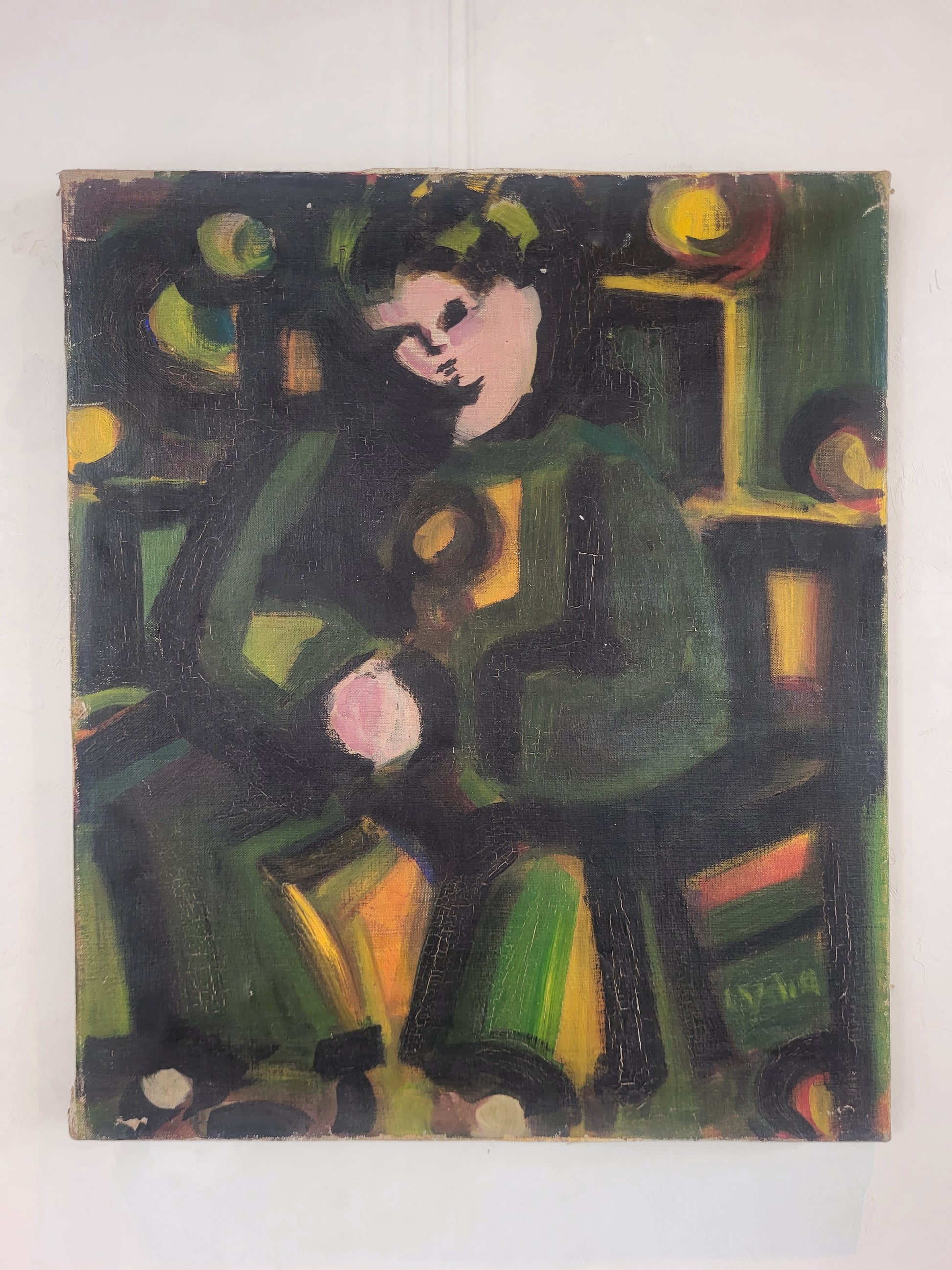 Portrait assis sur toile. Signature non identifiée.