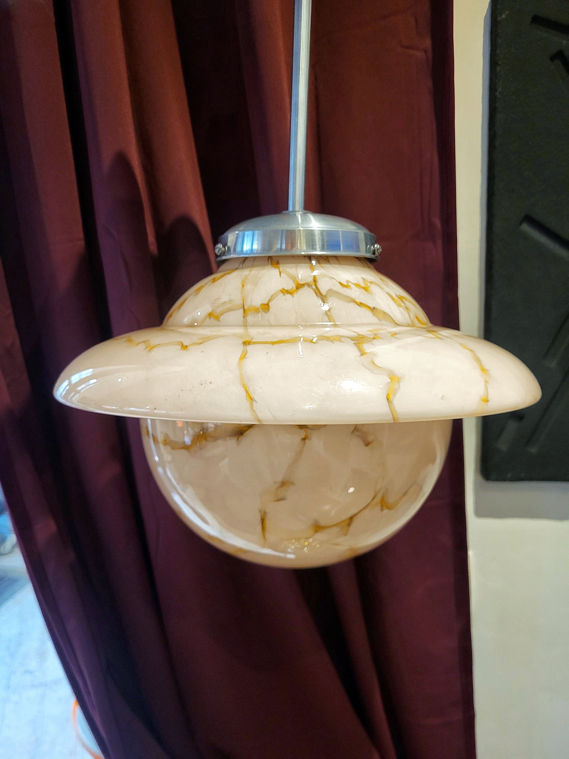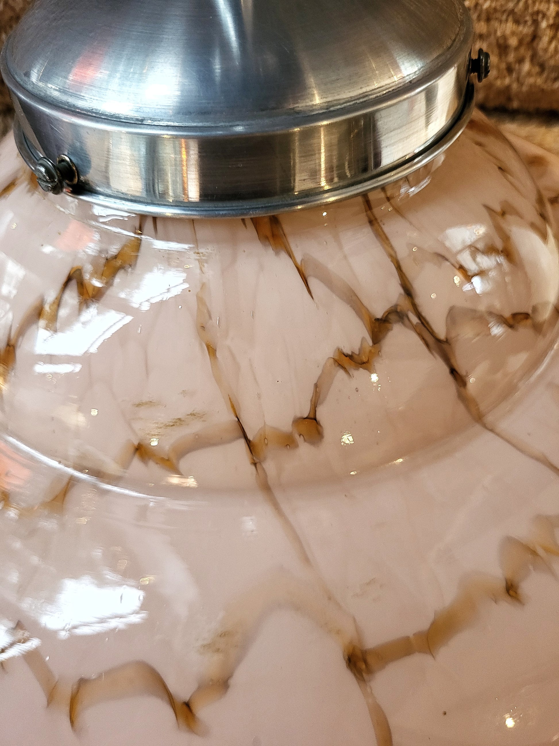 Suspension Italienne en verre soufflé de Murano, marbré et rose. Années 70. Rosace et tige en acier chromé.