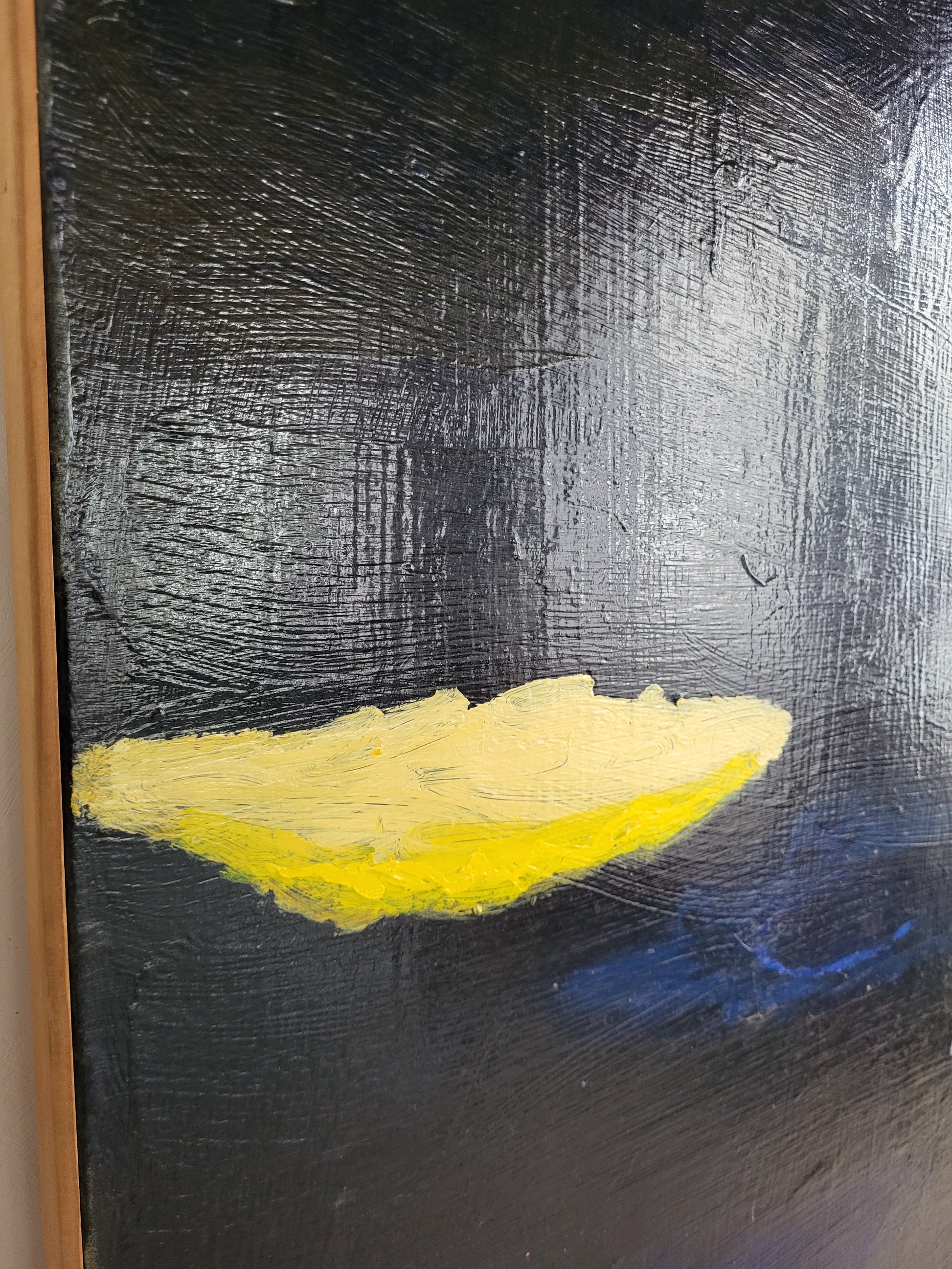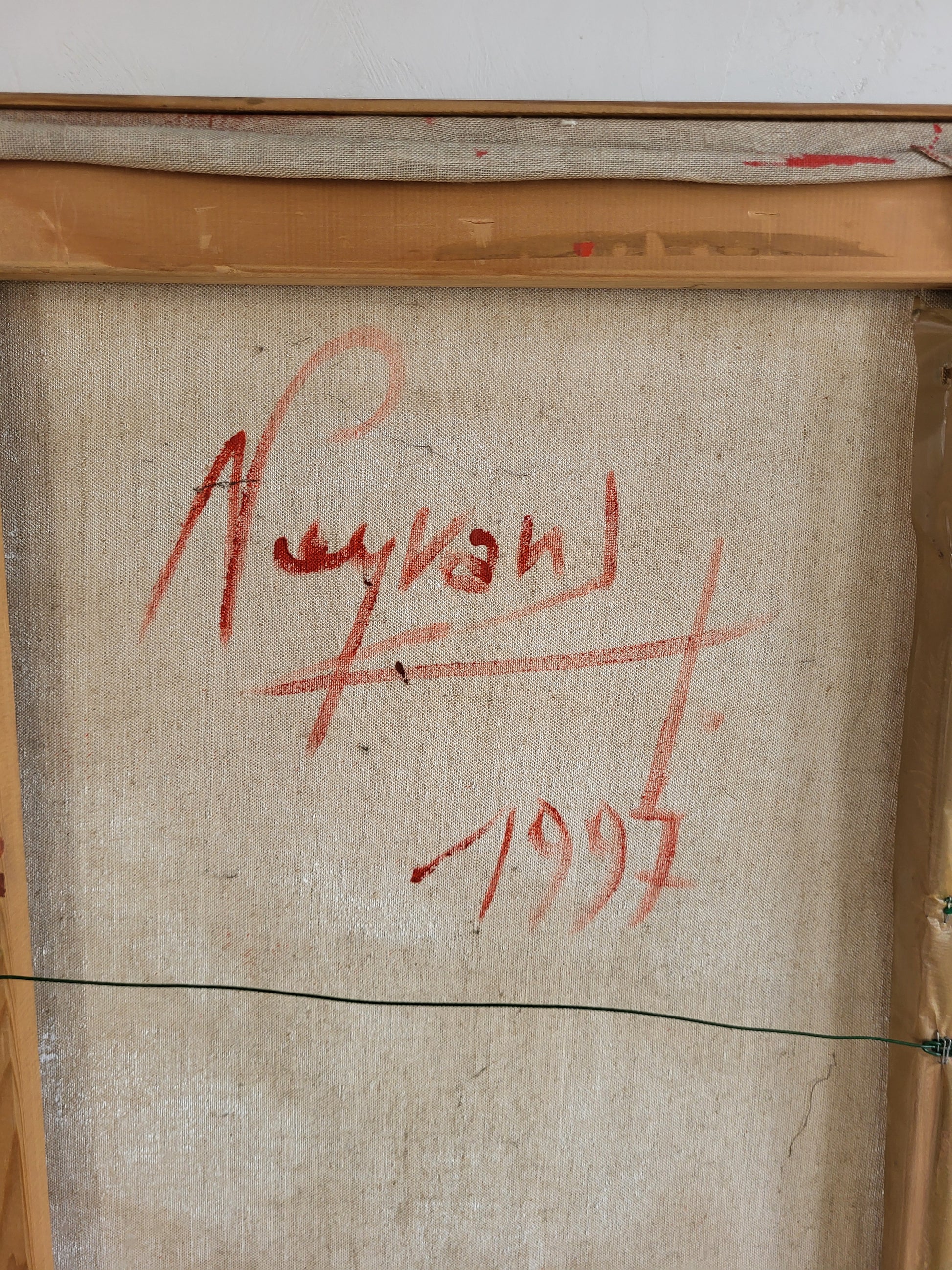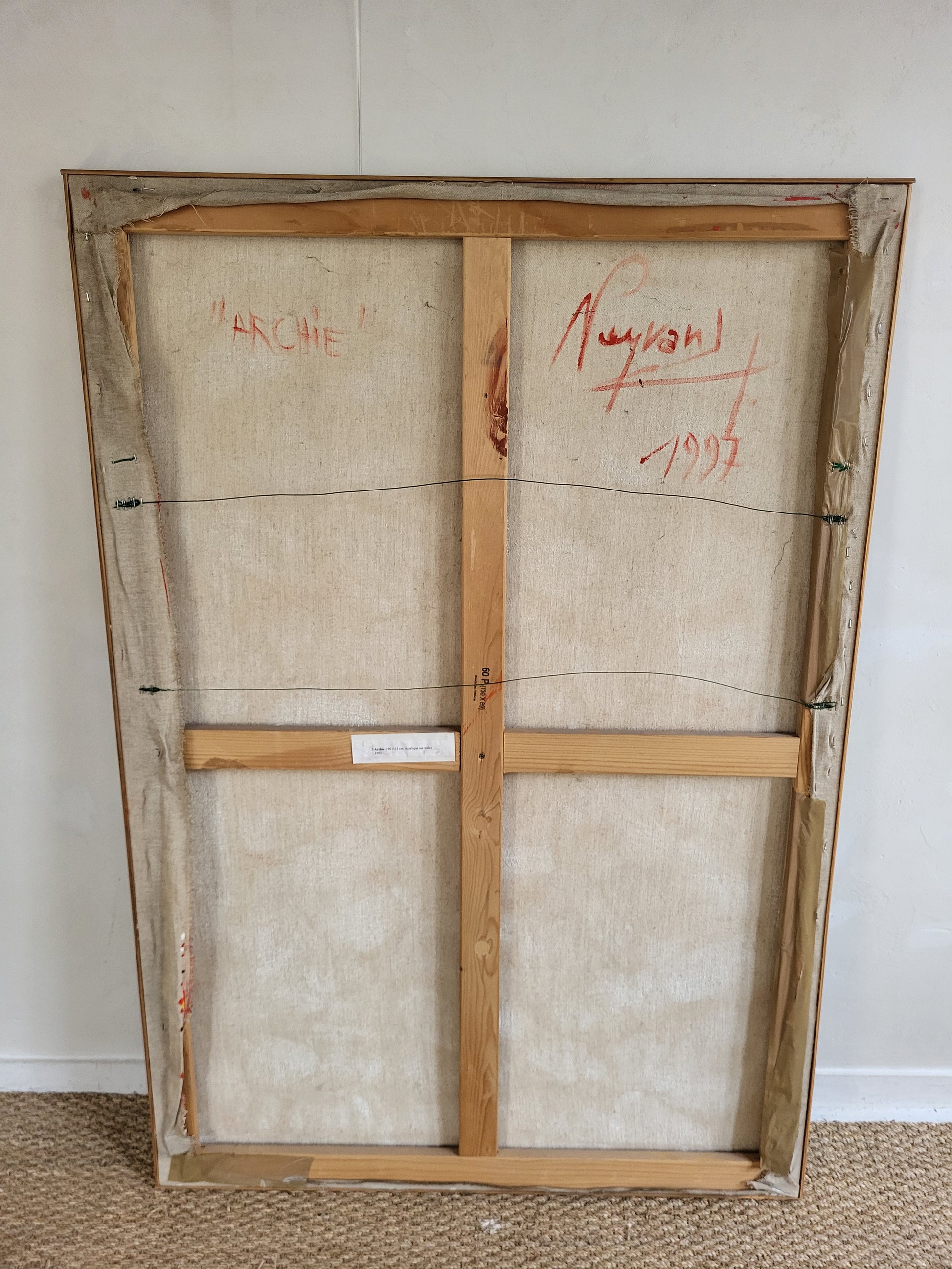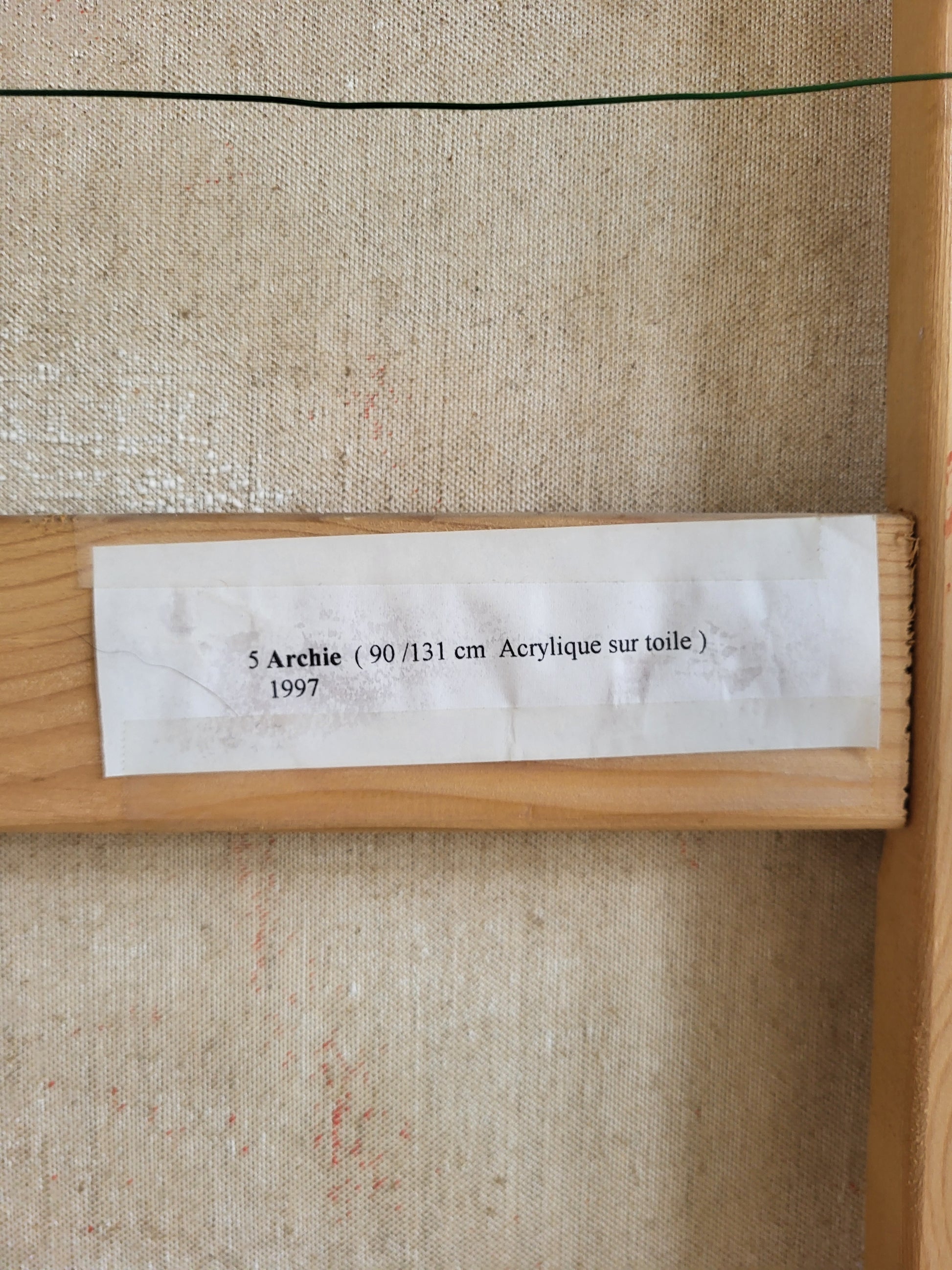 Toile abstraite sur canvas, encadrée. Signature au dos mais non identifiée. L'oeuvre est intitulée "Archie". 1997